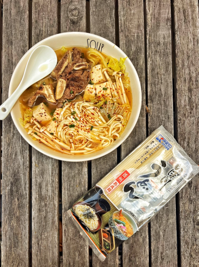- Cook Udon on the side and add to the soup. Top with Scallion and Togarashi.